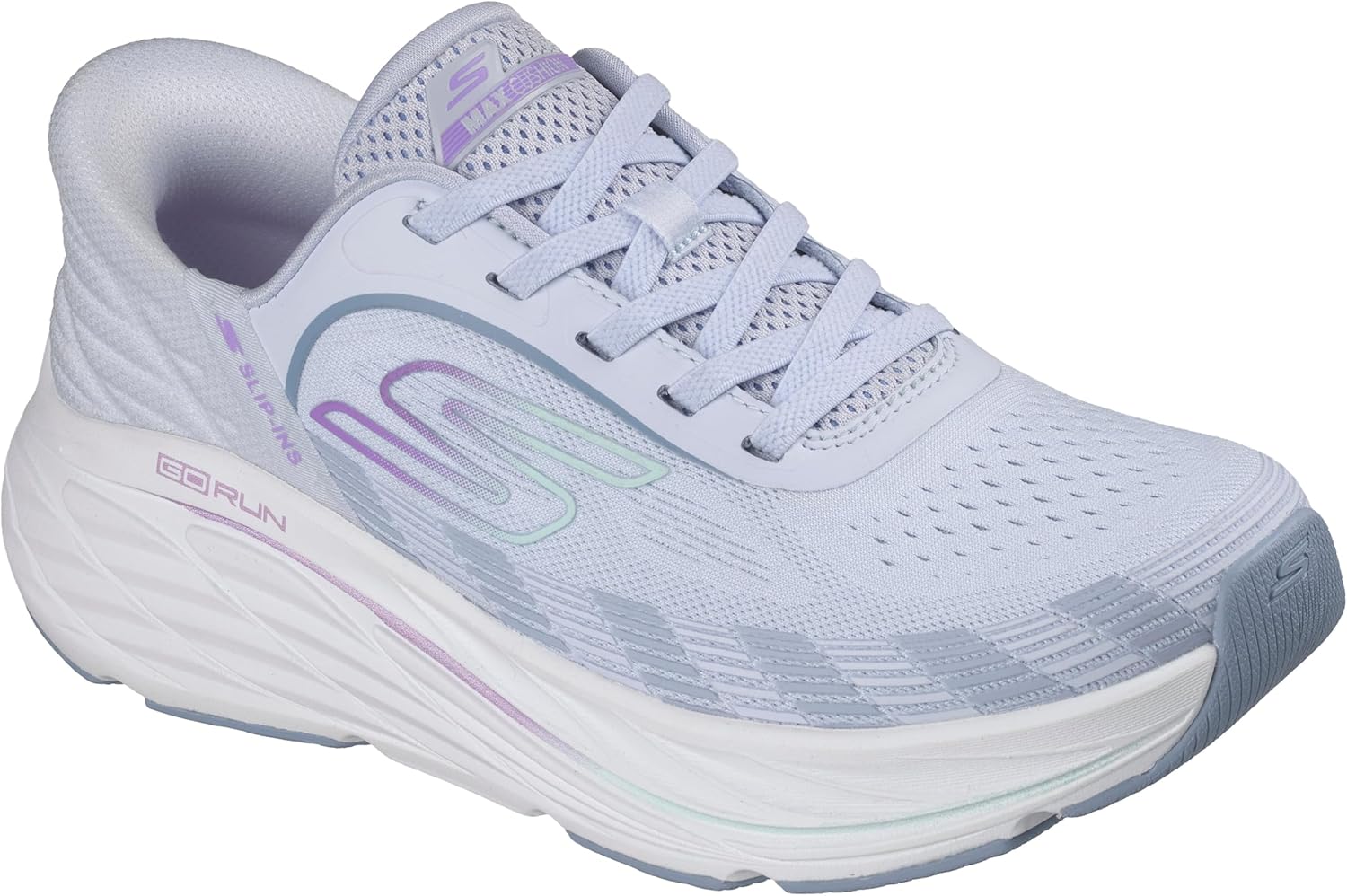 Skechers Hands Free Slip-Ins: Max Cushioning Elite 3 - Lenara has a breathable athletic mesh upper with elastic bungee laces that function as a slip-on. It features our Hands Free Slip-Ins technology, Max Cushioning design for support and comfort, Ultra Go midsole cushioning, and Natural Rocker Technology for smooth transitions. This vegan design has an SKX Grip durable rubber outsole, an Air Cooled Goga Mat comfort insole, and is machine washable.