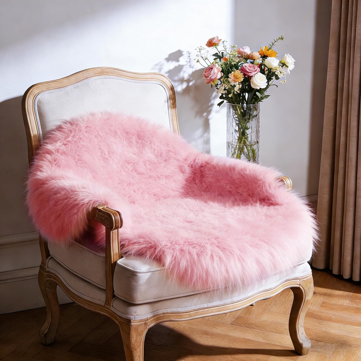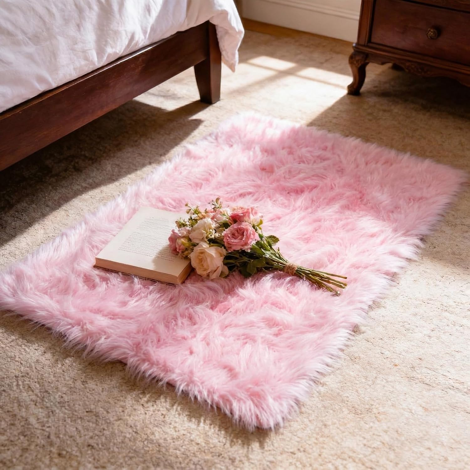 Ultra Soft Faux Fur Rug, Fluffy Shaggy 3Ft Round Area Rug, Pink Plush Faux Sheepskin Style Rug for Bedroom Nursery Living Room
